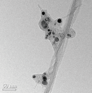 碳納米管的透射電子顯微鏡(TEM)圖像,深色區域為金屬顆粒,附著在無定形石墨材料和長單壁碳納米管上