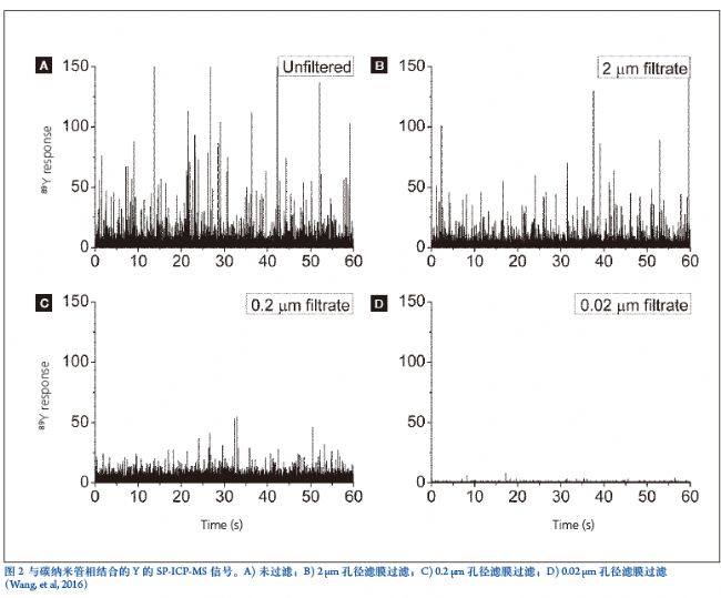 圖2 顯示了 Y 的 SP-ICP-MS 信號,其中每個信號峰代表一根單壁碳納米管的 Y 信號。隨著過濾孔徑的越來越小,越來越少的碳納米管可以通過濾膜,因此 Y 信號越來越小。這說明 Y 納米粒子與碳納米管結合在一起,當碳納米管出現時,可以觀察到 Y 信號,當碳納米管被濾除時,Y 信號消失。
