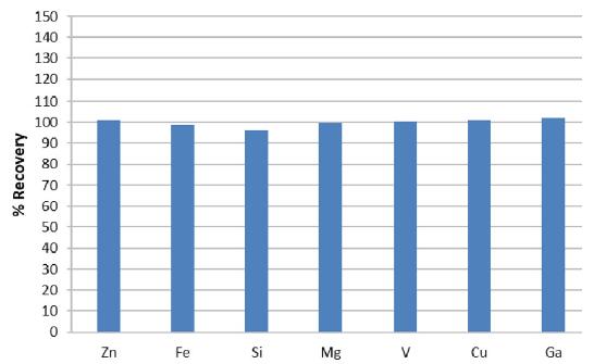 樣品以 5% 硝酸(v/v)消解,所有分析在 1% Al 溶液中進行(與樣品消解后的溶液介質接近),并按照其對雜質元素含量的規定進行加標回收實驗。