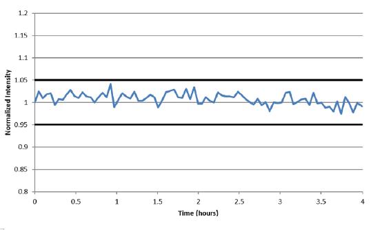 通過 4 小時連續分析 1% Pb 溶液中內標物 鈧(Sc)的光譜信號強度的變化考察儀器的穩定性,結果見圖 2,信號強度的波動在 ±4% 以內,表明儀器有著良好的穩定 。