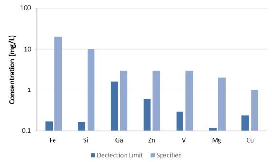 圖 3. 1% Al 溶液中各雜質元素的檢出限(深藍色)和倫敦金屬交易所金屬鋁標準規范要求(淺藍色,按 100 倍稀釋 99.70% 純 Al 計算)