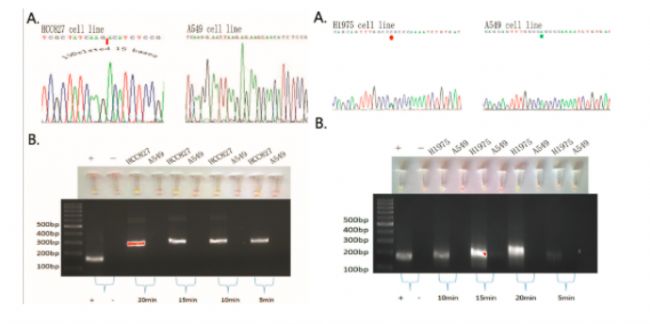 文章中,作者比較了在PCR,測(cè)序以及ARSP在非小細(xì)胞肺癌中EGFR突變檢測(cè)應(yīng)用,發(fā)現(xiàn)在非小細(xì)胞肺癌細(xì)胞系中,5分鐘便能檢測(cè)到EGFR 19Del(2)缺失突變,10分鐘檢測(cè)EGFRL SNP 突變,實(shí)現(xiàn)肉眼快速判斷(圖1),并在組織樣本中同樣得到驗(yàn)證(圖2)。