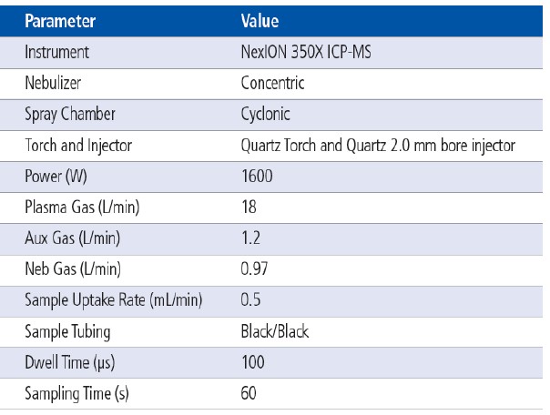 實(shí)驗(yàn)數(shù)據(jù)采集使用珀金埃爾默NexION系列ICP-MS和納米應(yīng)用Syngistix模塊軟件,并使用下表的參數(shù)。