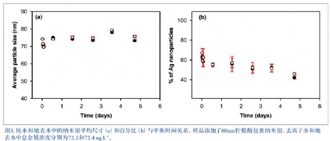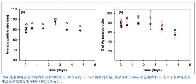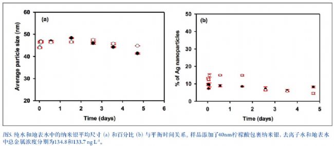 裸露的80nm納米銀,地表水中平均顆粒直徑和顆粒百分比高于去離子水。檸檬酸包裹納米銀,二者無(wú)明顯差別。這可能是由于單獨(dú)納米粒子比檸檬酸包裹納米粒子更易團(tuán)聚。但總體來(lái)說(shuō),并未觀察到嚴(yán)重地團(tuán)聚現(xiàn)象。