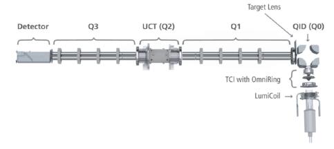 四極桿離子偏轉器(Q0)具有到動態掃描和固定離子篩選模式,第一個質量分析器(Q1)可用作質量分析器或離子導桿,通用池四極桿(Q2)靈活選擇離子導桿(STD)、動能歧視(KED)和動態質量帶寬調諧(DRC)模式,第二個質量分析器(Q3)可用作質量分析器或離子導桿。