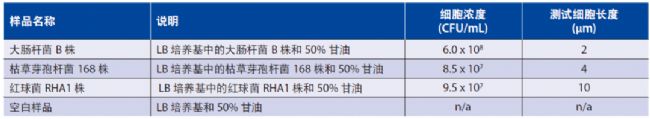 大腸桿菌B株(Eco),枯草芽孢桿菌168株(BAC) 和紅球菌RHA1株(RHA),其菌株的細胞尺寸分別約為2μm、4μm和10μm±2。經(jīng)過培養(yǎng)后,被等分成1mL樣本,并儲存在50%的甘油中于-20℃保存。