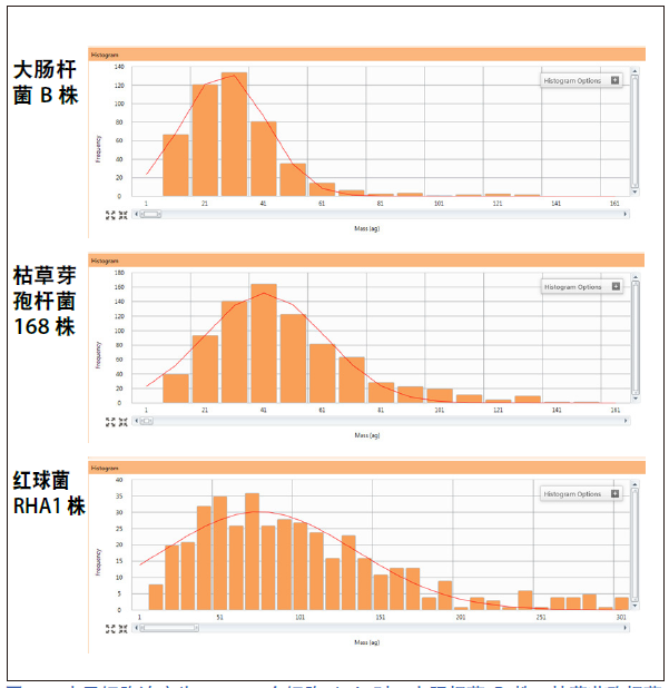 細胞濃度為50,000個細胞/mL時,大腸桿菌B株、枯草芽孢桿菌168株和紅球菌RHA1株的56Fe的信號掃描圖。橫坐標單位為ag,表明了單個細胞中鐵含量的分布情況。其中大腸桿菌B株的單個細胞平均鐵含量最低,而紅球菌RHA1株的單個細胞平均鐵含量最高。