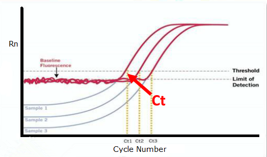 ▲隨著循環次數的增加,被擴增的目的基因片段呈指數規律增長,通過實時檢測與之對應的隨擴增而變化熒光信號強度,求得Ct值,同時利用數個已知模板濃度的標準品作對照,即可得出待測標本目的基因的拷貝數