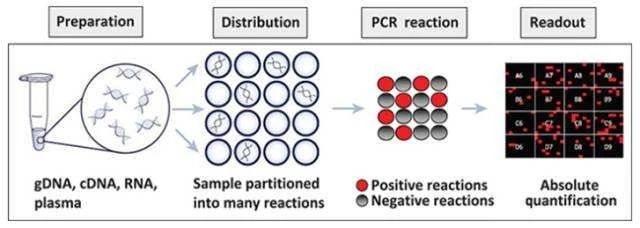 ▲數字PCR流程大致分為:樣品制備、目標基因分配、RCR擴增、結果讀出