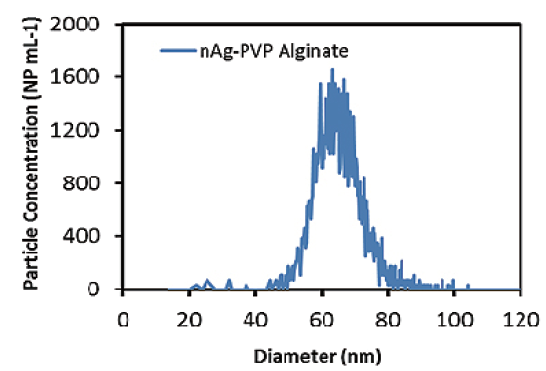 圖1顯示了0.1ppb(50,000粒/mL)Ag ENPs標準品的粒徑分布,相當于66.1±0.1nm的平均粒徑,濃度為52,302±2102粒/mL。對粒徑的測試結果和TEM定值的一致性表明海藻酸鹽基并不影響測量精度。