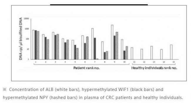 分別檢測了10個來自III期或IV期CRC患者和5個健康個體的血漿樣品。來自CRC患者的所有血漿DNA樣本的高甲基化WIF1和NPY得分均為陽性,而在健康個體中未檢測到高甲基化的WIF1和NPY。通過將WIF1和NPY濃度與ALB參考濃度對比評估,血漿DNA中的高甲基化WIF1比例范圍為8%至93%,而高甲基化NPY的比例范圍為0.1%至78%。血漿樣品中檢測到的最低甲基化WIF1和NPY量分別為5.1和1.2cp/μL。