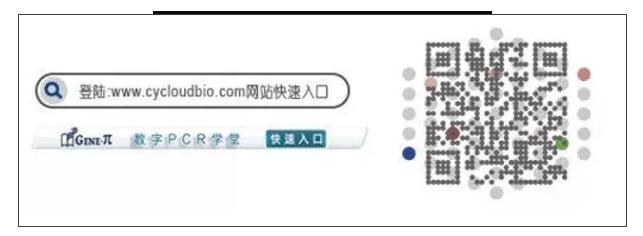 為了方便大家更好的學習數字PCR相關知識,我們為大家提供了Gene-π數字PCR學堂(www.cycloudbio.com數字PCR學堂快速入口),您可以選擇感興趣的應用教程,其中包含從實驗設計到數據分析的詳細工作流程。您還可以通過搜索導航工具直接搜索特定的項目("dPCR的DNA準備","熒光溢出"等),或點擊我們的"HOW TO" 選擇您需要的部分(設計、分析、報告)。詳細信息可登陸網站或掃描二維碼查看。
