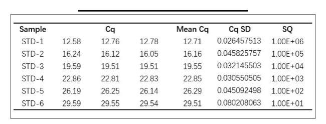 絕對定量是通過樣品的Cq值和標準曲線進行比較實現的。首先為了建立標準曲線,需要已知拷貝數濃度的標準品,對標準品進行5次以上的連續梯度稀釋,將稀釋的標準品進行實時熒光定量PCR擴增,最后根據各樣品的拷貝數濃度及相應的Cq值繪制標準曲線,得到線性方程Cq= -klgX0+b,其中X0為起始模板量。然后將未知樣本的Cq值與此標準曲線進行比較,確定其拷貝數濃度。