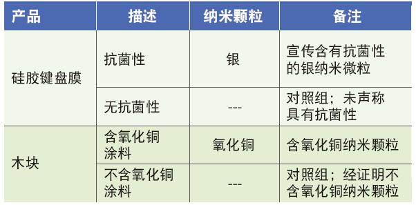 本項研究中,我們檢測了兩種不同的消費品:含銀硅膠鍵盤膜和噴涂了含氧化銅涂料的木塊(表1)。
