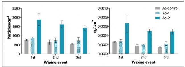 圖1.用抹布擦拭時鍵盤膜上的銀納米微粒遷移情況。左邊:每平方厘米遷移的微粒數量。右邊:質量遷移,單位:納克/平方厘米。誤差線表示三個樣本的平均值標準誤差。“銀對照樣本”指不含銀納米微粒的鍵盤膜。