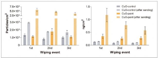 本文探討了納米材料表面上的納米顆粒如何遷移到抹布上,并集中討論了納米顆粒釋放的幾大特征:總質量濃度、顆粒數量濃度及顆粒尺寸分布。我們檢測了因抗菌性而被廣泛使用的銀納米顆粒,及油漆涂層表面的氧化銅納米顆粒的遷移情況。