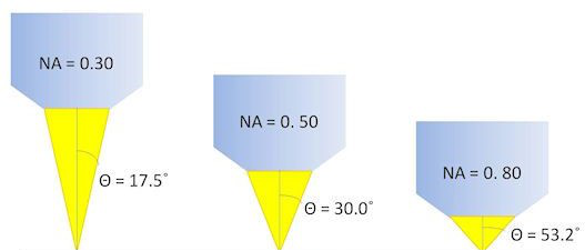 如果我們知道光的顏色(綠光的λ約為0.53微米)和玻璃光學元件的性質(數值孔徑即NA), 數值孔徑表征物鏡的聚光能力,是物鏡的重要性質之一。理論上NA=nsinθ,因此增大物鏡的數值孔徑(NA)有兩個途徑:
