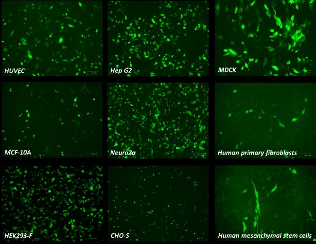 1.適合難轉(zhuǎn)染的細(xì)胞系:在難轉(zhuǎn)染的細(xì)胞上獲得最大的基因表達(dá),實現(xiàn)了原代細(xì)胞(上皮、內(nèi)皮、肝細(xì)胞、成纖維)、干細(xì)胞(ES、iPS、MSC)超高的轉(zhuǎn)染效率。