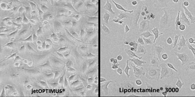 圖3:與 Lipo3000對比發(fā)現(xiàn),jetOPTIMUS®轉(zhuǎn)染Vero細(xì)胞24h后,細(xì)胞狀態(tài)良好。