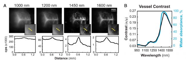 活體成像的圖像對比度和穿透深度可以通過選擇紅外二區成像波長進行調節。在NIR-II波段中,水的吸收峰值(接近1450 nm)處,成像可以獲得最高的圖像對比度。