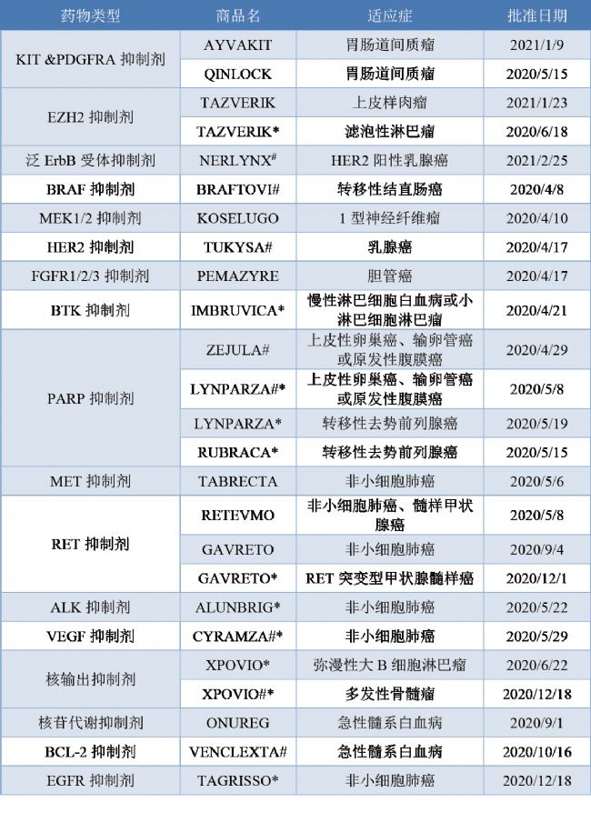 縱觀2020年FDA審批通過的抗腫瘤小分子抑制劑,共有14種新藥,11種擴大藥物適應癥,8種需與其他藥物聯合療法。值得一提的是Epizyme公司的TAZVERIK,是一種高活性、高選擇性的表觀遺傳藥物,也是FDA優先批準的首個EZH2抑制劑,EZH2是一種組蛋白甲基轉移酶,如被異常激活,將導致腫瘤細胞異常增殖。同時,TAZVERIK也是FDA首款針對ES患者的藥物。在早期臨床治療中,TAZVERIK就顯出可接受的安全性,且有效地縮小甚至消除腫瘤。另外該藥物還有一份用于復發或難治性濾泡性淋巴瘤療法的新藥申請正在接受FDA優先審查。我們期待在2021年能在現有藥物擴大適應癥的同時,審批通過更多有價值的新的抗腫瘤小分子抑制劑。