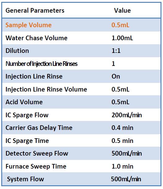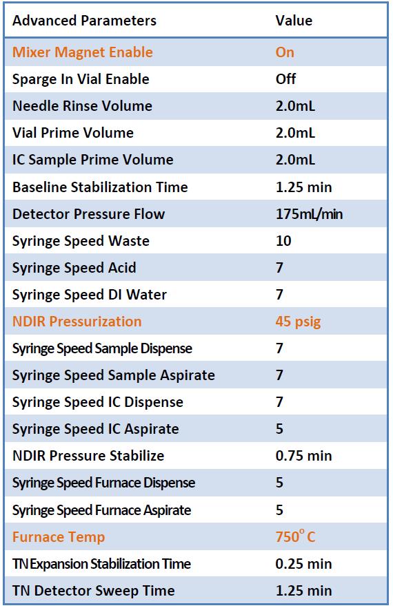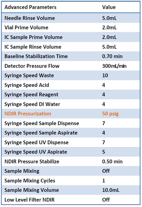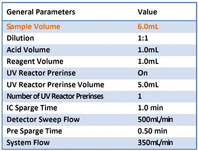 兩個使用靜壓濃度(SPC)技術的儀器被配置用于分析從不同的湖泊和池塘收集的樣品中的TOC,每臺儀器分別采用飲用水分析的方法參數(表2和表3)。