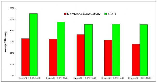 Figure 1 在0.8% NaCl條件下,隨著TOC濃度的增加,兩臺分別采用膜電導率和NDIR檢測技術的TOC分析儀的比較。在分析之前,每個分析儀都根據其制造規格進行校準