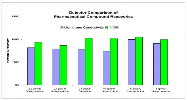 Figure 2利用膜電導率與NDIR檢測技術對比藥物化合物的回收率