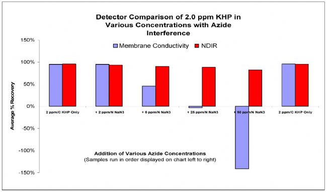 對比圖1中0.8%氯化鈉濃度下的鹵水樣品,可以看出NDIR檢測的優越性。NDIR檢測器遠遠超過膜電導率檢測分析鹽水的能力。圖2顯示,難以氧化的藥物化合物 (由于它們復雜的分子結構和不同的氮、硫和碳含量) 的比較。如所示,與NDIR檢測器相比,膜電導率檢測器不能有效地回收這些化合物。圖3和圖4表明,隨著氮濃度的增加,樣品中的氮化學物質 (及其各自的氧化產物) 對膜的電導率TOC回收率有負影響。相比膜電導率技術,NDIR檢測技術在所有的化合物分析以及廣泛的水樣品基質分析中,表現出優越的回收率和精度。