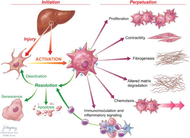 雖然免疫代謝的新概念主要集中在免疫細胞,但HSCs也顯著促進了metainflammation和組織損傷的收斂途徑,特別是在酒精性和非酒精性脂肪性肝炎(NASH)中。通過控制類視黃醇代謝,它們調(diào)節(jié)肝臟和全身免疫中的免疫細胞功能。星狀細胞產(chǎn)生炎癥介質(zhì)的反應,包括細胞因子和趨化因子,可以放大肝臟對損傷的反應。