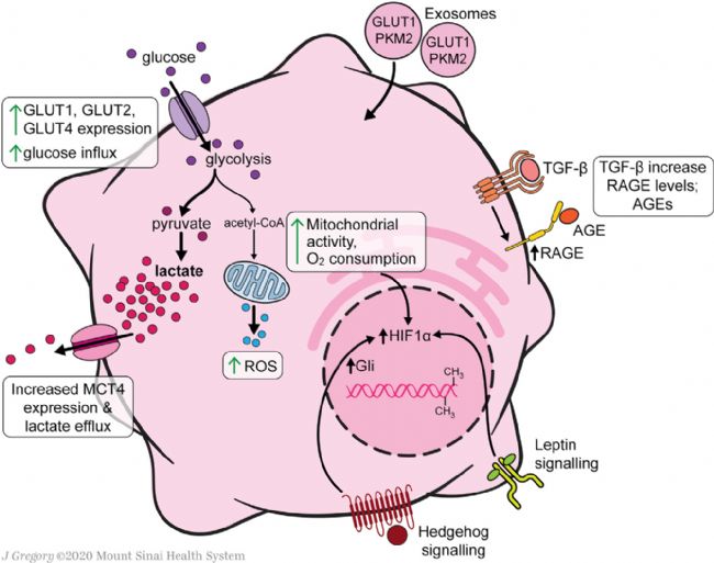HSC中心碳代謝重編程在細胞活化中起著重要作用,因為它們上調(diào)糖酵解以滿足轉(zhuǎn)分化為肌成纖維細胞表型的能量需求(Figure 2)。HSCs葡萄糖穩(wěn)態(tài)調(diào)節(jié)的研究幾乎完全集中在培養(yǎng)的細胞,因此未來的研究將需要在體內(nèi)疾病模型中驗證這些發(fā)現(xiàn)。與靜息的HSCs相比,活化的人HSCs(aHSCs)和培養(yǎng)活化的大鼠HSCs提高了葡萄糖利用率,原代培養(yǎng)激活細胞增強了葡萄糖轉(zhuǎn)運能力和糖酵解活性、葡萄糖轉(zhuǎn)運體GLUT1、GLUT2和GLUT4在原代培養(yǎng)激活永生性的大鼠HSCs中表達,并可在這些條件下通過高細胞外葡萄糖或嘌呤能信號進行調(diào)節(jié),此外GLUT1在癌細胞中也有很高的表達。