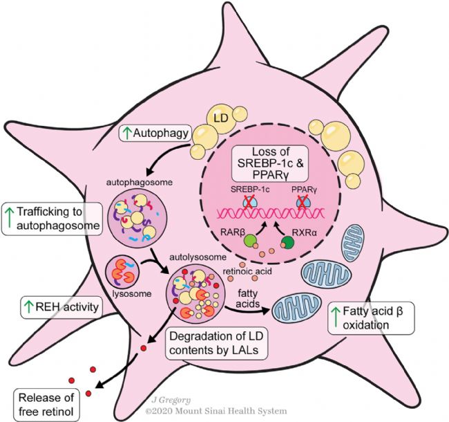 維生素A穩(wěn)態(tài)的調(diào)節(jié)是HSCs在健康和損傷肝臟中的一個本質(zhì)特征。HSCs儲存50%-95%的人體維生素A,由視黃醇及其代謝物組成。超過95%的類視黃醇以視黃酯(REs)形式儲存,占HSC細胞質(zhì)脂滴含量的30%-50%。在HSCs中,類視黃醇與幾種脂滴蛋白有關(guān),包括脂肪分化相關(guān)蛋白(ADRP)、脂肪素、perilipin 5、ATGL和CGI-58,以及肝脂肪酸結(jié)合蛋白(L-FABP)。一般來說,更高的perilipin表達降低了HSC的激活,可能是通過穩(wěn)定類視黃酯液滴來減弱它們對提供能量的脂肪酸的分解代謝。