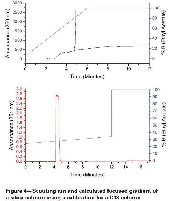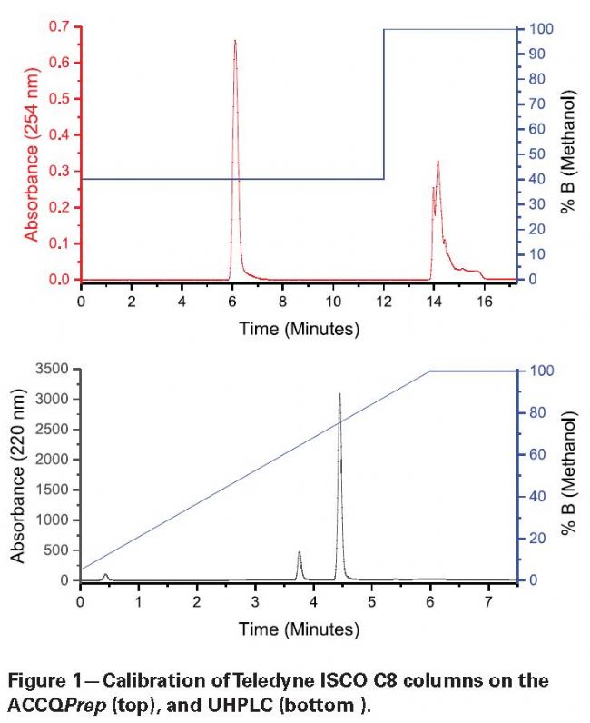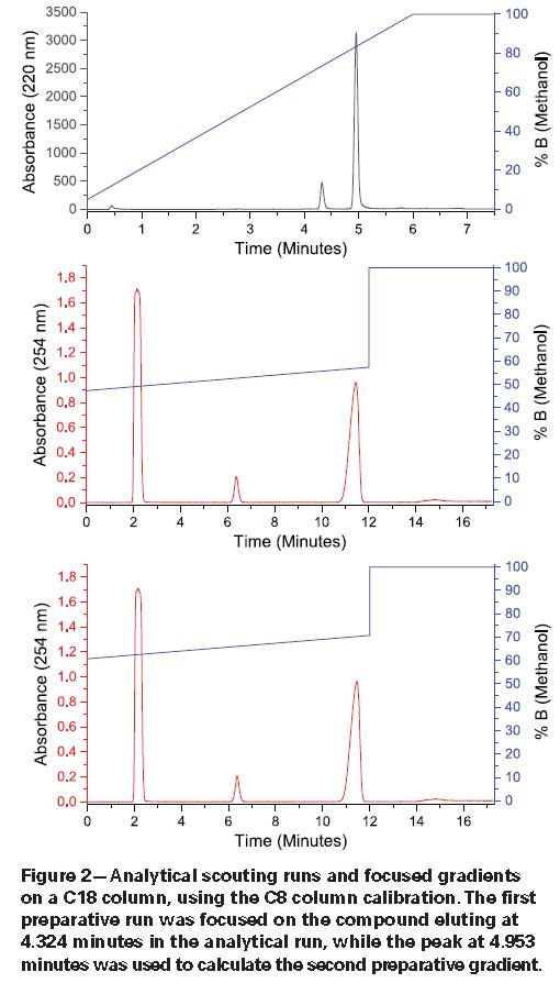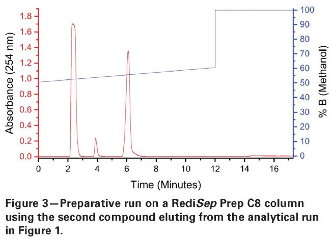 使用C18分析運(yùn)行的數(shù)據(jù)計(jì)算圖2中的制備型梯度,同時(shí)使用圖1中的C8色譜柱的校準(zhǔn)。制備純化是采用RediSep Prep C18柱(20x150 mm, 5µ,100Å, PN 69-2203-810)。兩種情況下,化合物洗脫時(shí)間都接近預(yù)期的6分鐘洗脫時(shí)間。