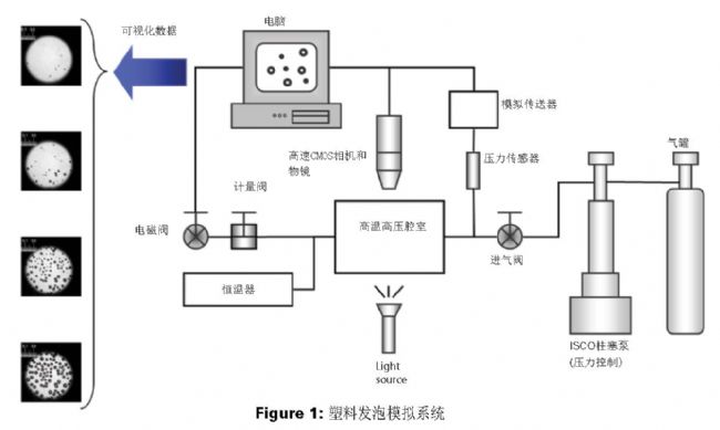 在下一頁,圖1展示了郭等人開發(fā)的間歇發(fā)泡可視化系統(tǒng)示意圖,實(shí)驗(yàn)發(fā)泡模擬系統(tǒng)由高溫高壓室組成,每個(gè)發(fā)泡試驗(yàn)都要密封一個(gè)小塑料樣品。腔室內(nèi)的溫度和壓力由帶有PID反饋控制的電加熱器和通過Teledyne ISCO柱塞泵的計(jì)量氣體供應(yīng)。該腔室配有兩個(gè)藍(lán)寶石窗口,以便觀測(cè)塑料樣品。一套包含高速攝像機(jī)與高倍率變焦耦合安裝透鏡的光學(xué)系統(tǒng)和光纖傳輸光源,用來在發(fā)泡過程中對(duì)塑料樣品進(jìn)行明亮的現(xiàn)場(chǎng)觀察和視頻記錄。系統(tǒng)中集成了一個(gè)計(jì)算機(jī)系統(tǒng),用來控制排氣閥的開啟,觸發(fā)高速攝像機(jī),并預(yù)先設(shè)定傳感器記錄數(shù)據(jù)。