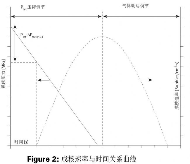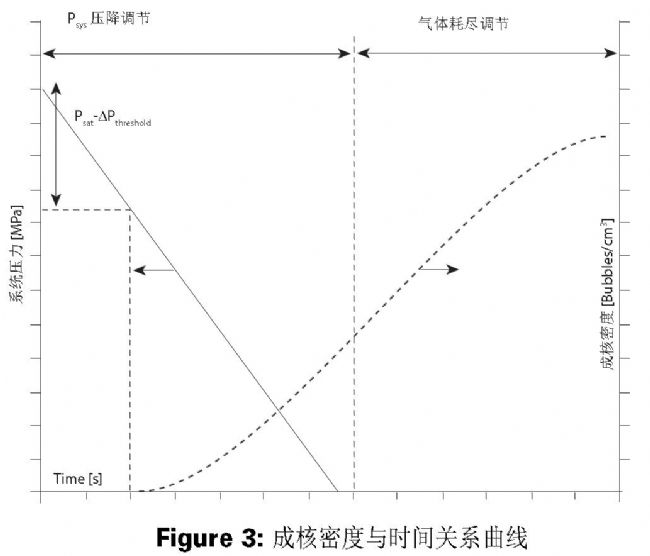 圖2描述了氣泡成核速率與時(shí)間的關(guān)系曲線,圖3描述了氣泡密度與時(shí)間的關(guān)系曲線。在初始發(fā)泡階段,由于壓降引起的過飽和,成核速率增加。由于氣泡成核和生長,聚合物中的氣體濃度降低,成核速率降低,最終降至零。這導(dǎo)致成核速率分布如圖2所示。