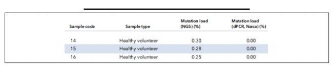 ☑與NGS相比,dPCR具有更低的背景噪聲。使用naica®微滴芯片數字PCR系統,非患者樣本中的突變等位基因沒有陽性信號,符合預期。