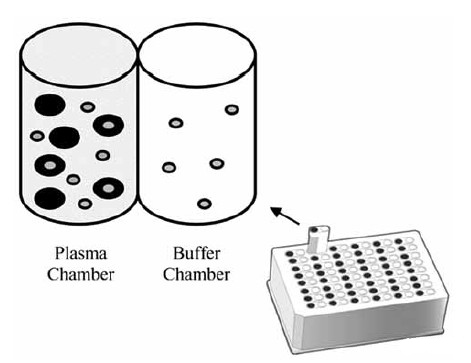 平衡透析法測定血漿蛋白結合率是用透析膜將蛋白質溶液與緩沖液分隔開,建立在兩者之間的一種平衡狀態,只有分子量小的藥物小分子可以通過。透析的動力是擴散壓,擴散壓是由橫跨膜兩邊的濃度梯度形成的。透析的速度與膜的厚度、透析的小分子溶質在膜兩邊的濃度梯度及透析溫度等因素有關。平衡透析法能夠直接測出為與蛋白結合的藥物小分子的數量,這是分析蛋白與小分子物質結合的關鍵,從而能夠求出結合位點數及結合常數。