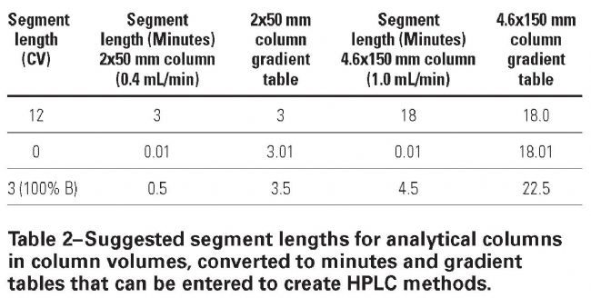 每段長度(以分鐘為單位)的計(jì)算方法是用梯度長度乘以柱體積,然后除以流速。梯度表是通過將分段長度加到前幾次的總和而得到的。在表2中,柱體積中的片段長度被轉(zhuǎn)換為時間,并將添加的片段長度形成梯度表。