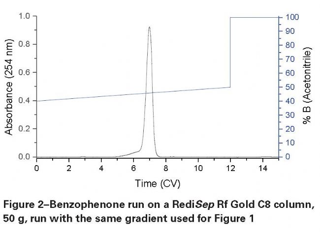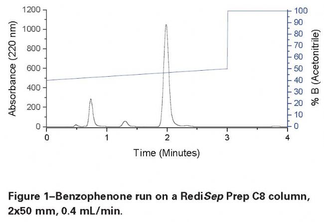 下面顯示的運(yùn)行使用了表2中列出的梯度片段。一次運(yùn)行使用2 × 50mm C8色譜柱,另一次使用4.6 × 150mm C18色譜柱。Benzophenone在水/乙腈體系的梯度洗脫。C8, 2x50 mm 運(yùn)行實(shí)例