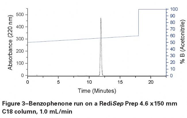 Teledyne ISCO 分析色譜柱在ACCQPrep® HPLC 系統(tǒng)通過一次簡單的偵查運(yùn)行即可生成分離方法。該流程不僅能匹配RediSep® HPLC色譜柱,也匹配RediSep Gold®金標(biāo)快速色譜柱,這意味著用戶可以同時開發(fā)閃式快速色譜的方法。來自其他供應(yīng)商的C18色譜柱也可以用于方法開發(fā),但與RediSep色譜柱相比,選擇性可能稍微存在差異,這意味著出峰時間可能不一定會在預(yù)期的時間被洗脫。在本應(yīng)用報(bào)告中描述的方法放大流程是有效的,只需將時間轉(zhuǎn)換成柱體積,因?yàn)橐粋化合物在某個特定溶劑組份的洗脫時間是特定的。另一種方法是使用ACCQPrep HP150使用RediSep Prep色譜柱和內(nèi)置在系統(tǒng)中的聚焦梯度發(fā)生器,從偵測運(yùn)行中快速創(chuàng)建聚焦梯度(參考應(yīng)用報(bào)告AN119)。