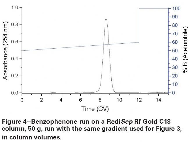 對于閃式快速色譜,首選洗脫時間約6個柱體積(CV),當(dāng)轉(zhuǎn)換為CV單位時,很容易將uHPLC梯度從一個色譜柱放大到另一個色譜柱。