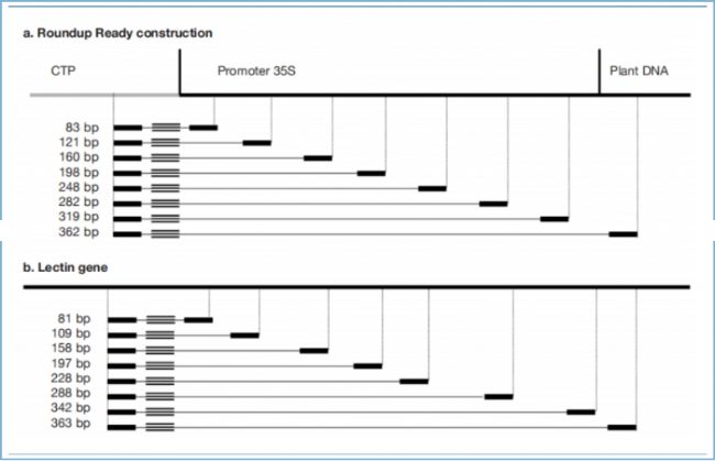 將大豆的RR和Lectin基因作為研究對象,各基因的正向引物被保留,反向引物以+/-40bp的步進移動以增加擴增子的大小。將正向引物保持在探針附近,以使探針在延伸步驟中被Taq聚合酶的核酸外切酶活性快速水解。RR擴增子大小分別為83、121、160、198、248、319和362bp。Lectin擴增子大小分別為:81、109、158、197、228、288、342和363 bp(圖1)。