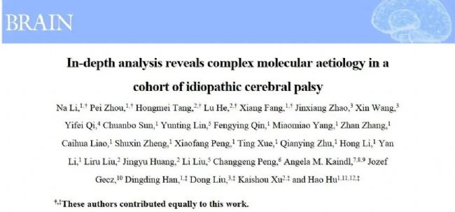 Li N, Zhou P, Tang H, et al. In-depth analysis reveals complex molecular aetiology in a cohort of idiopathic cerebral palsy. Brain. 2021 Jun 2:awab209. doi: 10.1093/brain/awab209. Epub ahead of print. PMID: 34077496.