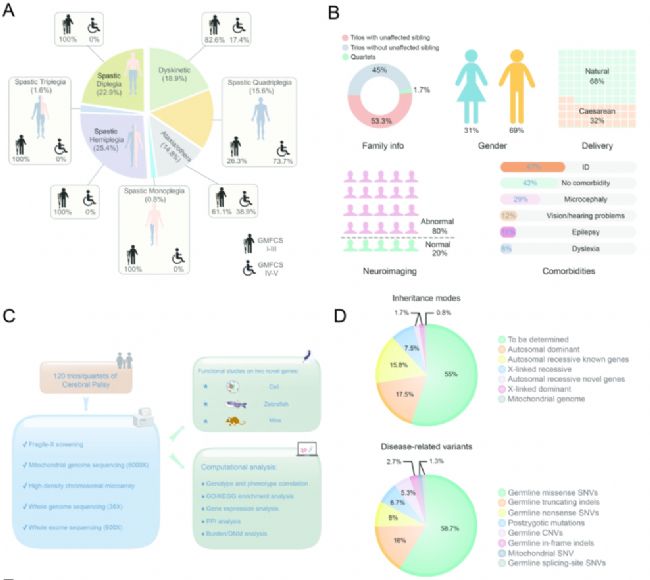研究人員總共招募了120個腦癱家庭。大多數患者屬于痙攣型腦癱,其次是運動障礙和共濟失調型腦癱。他們通過多個平臺對患者進行了全面的遺傳評估,包括靶向PCR分析、線粒體基因組測序(6000X)、細胞遺傳學芯片分析、全外顯子組測序(600X)和全基因組測序(36X)(圖1)。