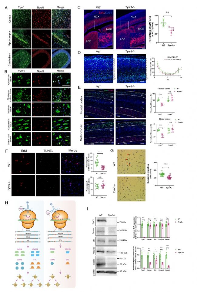 為了探索TYW1的表觀遺傳調控機制,研究人員還構建了一個模型來模擬懷丁苷水平如何影響核糖體移碼,以此來評估人、小鼠和斑馬魚胚胎發育時期腦蛋白質組受到的影響。他們發現,四種蛋白質受到了顯著影響,分別是CENPE、STIL、NCAPD2和SASS6。有意思的是,這四種蛋白質都參與了細胞周期和有絲分裂,據報道其缺陷與原發性小頭畸形有關。
