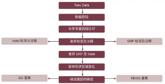 測序拿到原始數據后,可通過質控、與參考基因組比對、SNP calling 等步驟得到各樣本 SNP 標記分型信息。對于重測序而言,無論是 BSA 還是其他性狀定位方法,SNP 分型信息是后續分析的基礎。