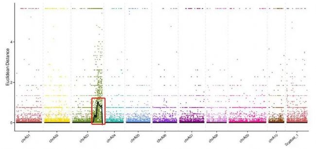 標記與性狀進行關聯是性狀定位最核心的部分,對于 BSA 而言,有兩種關聯方法,一種是 ΔSNP-Index,一種是歐式距離(Euclidean distance, ED)。