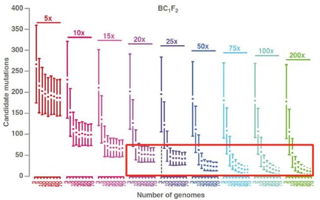 極端混池的樣本數量越多,混池測序深度越高,定位結果精度越高,但同時項目費用也會越高。有學者借助模式植物擬南芥專門針對子代混池樣本數和測序深度對定位結果的影響進行了研究。結果發現,當混池樣本數量達到 20 個,同時測試深度在 20X 以上的情況下,能夠得到相對理想的定位結果。超過這個數量,隨著成本消耗的增加,定位精度的提升效果有限。綜合考慮,通常推薦方案如下: