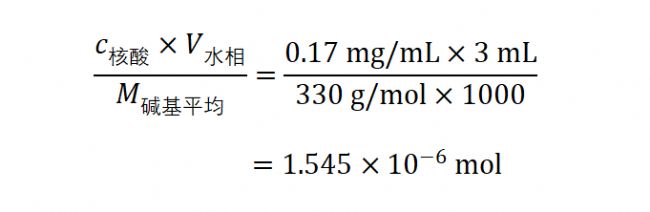 細心的讀者可能也發現了,在計算的過程中并沒有明確的核酸長度,這是因為核酸的長度并不會影響使用到的質量濃度。以單鏈RNA和上方計算得到的數值為例,在保持N/P比和N的物質的量不變的情況下,所需的P的物質的量也固定為1.545×10-6mol,而核酸的質量濃度與P的物質的量關系為: