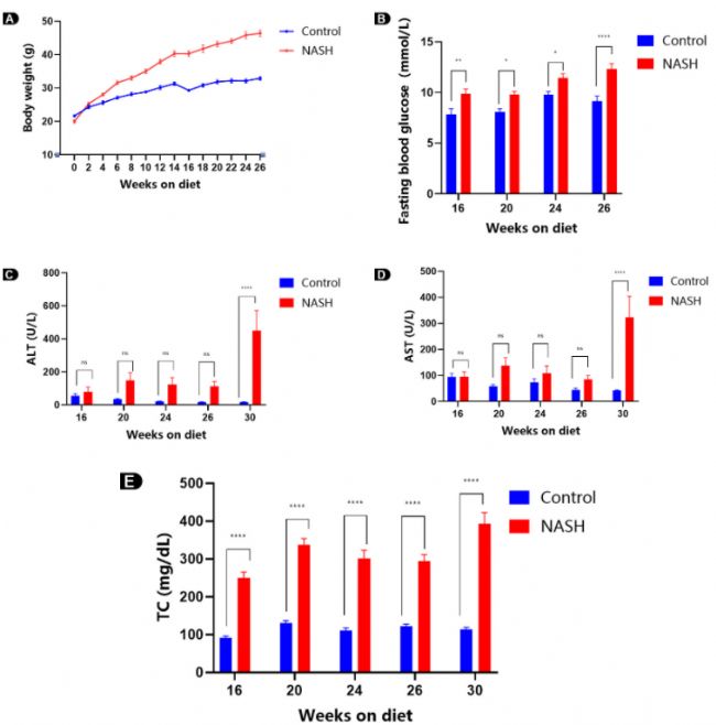圖1. 使用GAN高脂高膽固醇高果糖飲食誘導的NASH模型的體重及血生化檢測。將野生型C57BL/6雄鼠隨機分為2組,每組10只,分別用標準飼料(control組)和高脂、高膽固醇、高果糖飼料(NASH組)喂養,在不同時間點檢測各項指標:(A)體重;(B)6h空腹血糖值;(C)血清谷丙轉氨酶(ALT)濃度;(D)血清天冬氨酸轉氨酶(AST)濃度;(E)血清總膽固醇(TC)濃度。數據以Mean±SEM呈現。使用Two-way ANOVA進行統計學分析。ns: not significant, *: p<0.05, **: p<0.01, ***: p<0.001, ****: p<0.0001。
